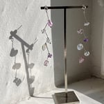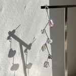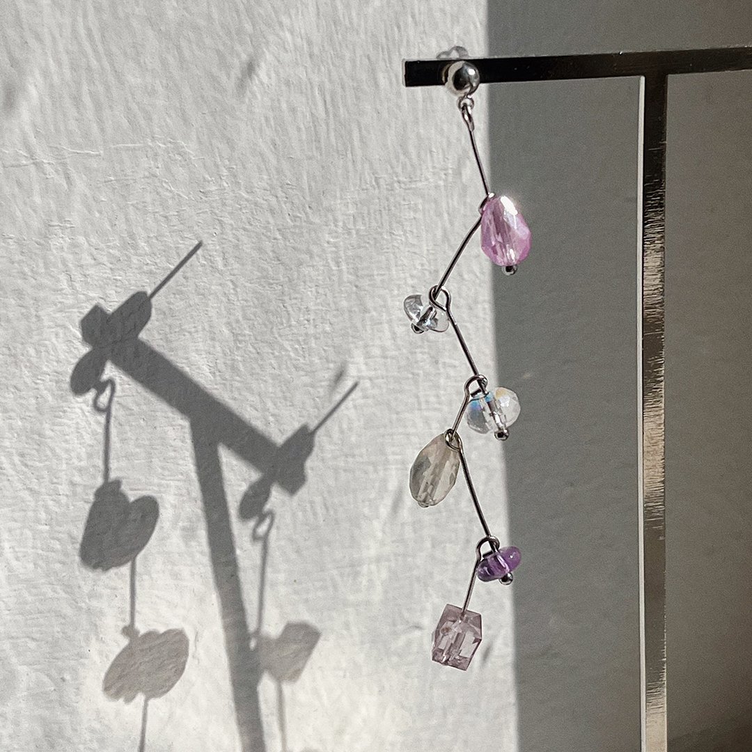 Ball post earrings with second-hand glass beads arranged in a playful zigzag line. A mix of clear and purple glass beads create a floating composition that moves gently with the wearer.