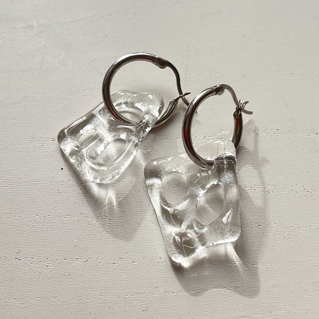 Hoops in silver paired with handmade clear glass pendants in a irregular grid form.