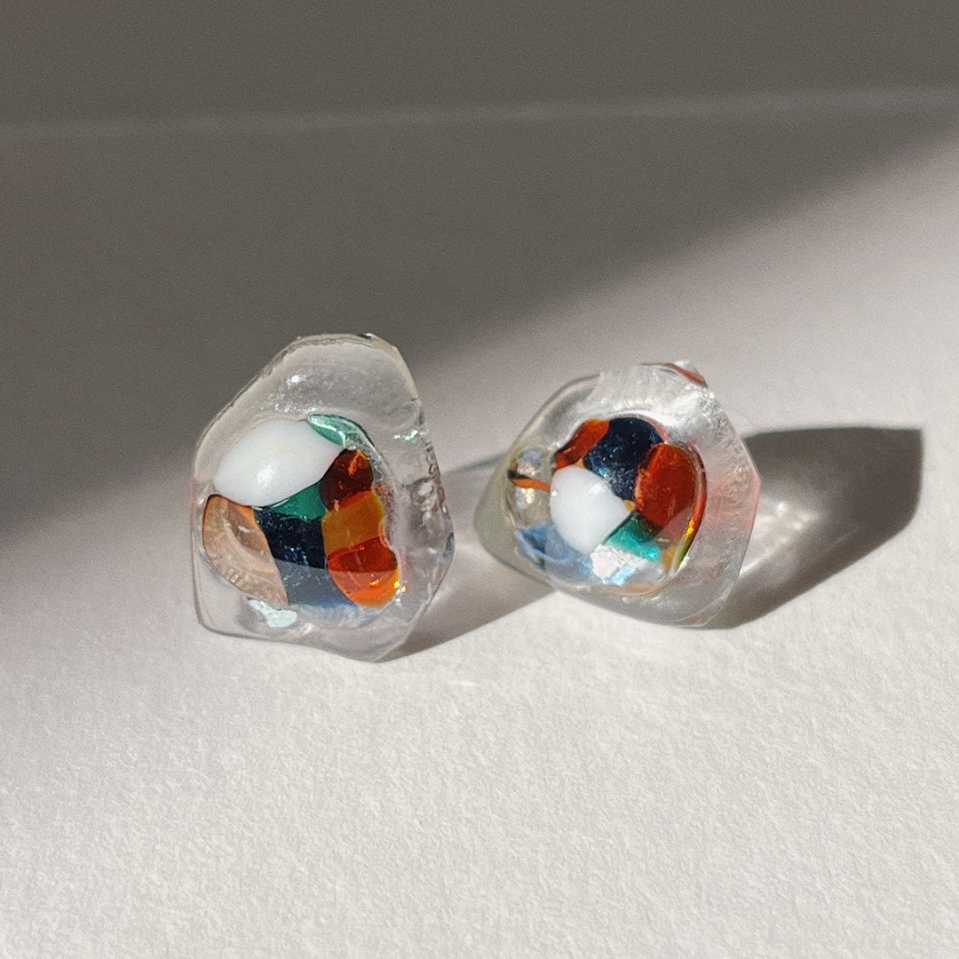 One-of-a-kind asymmetrical stud earrings handcrafted from recycled clear glass with a mosaic of white, amber, and deep blue tones.