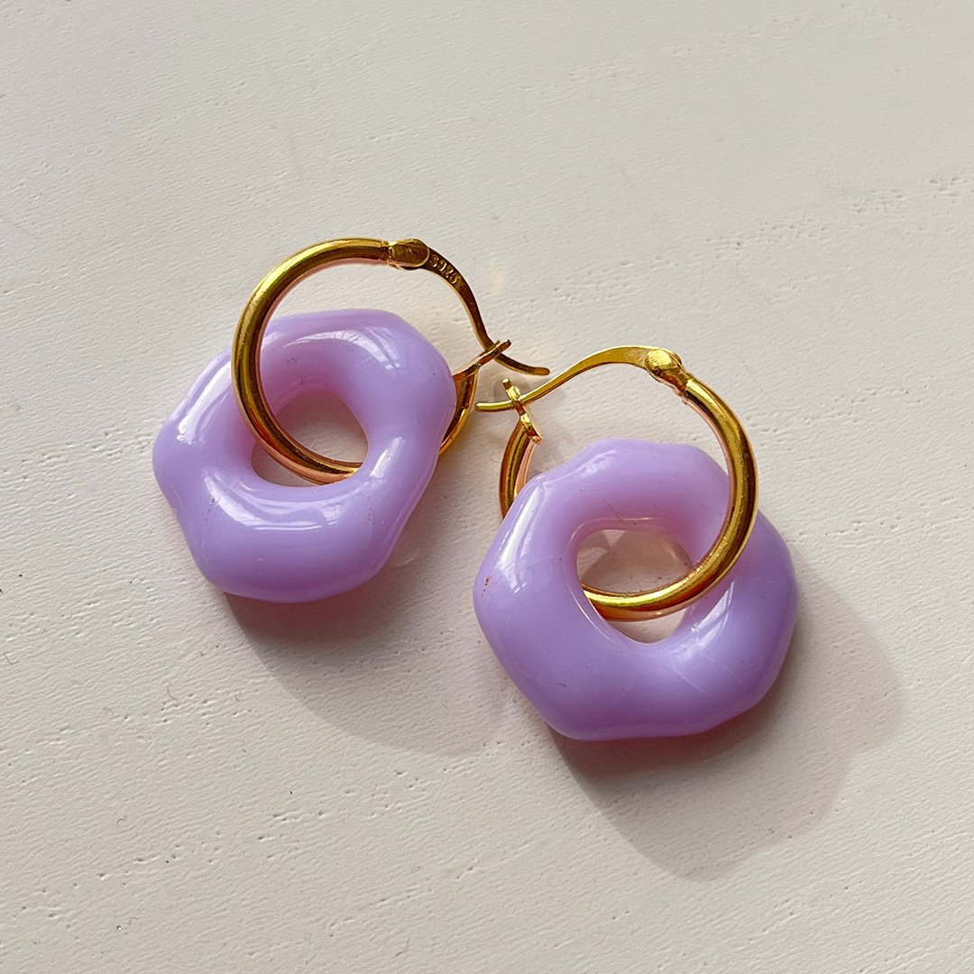 Hoops in gold paired with handmade pastel purple glass pendants.