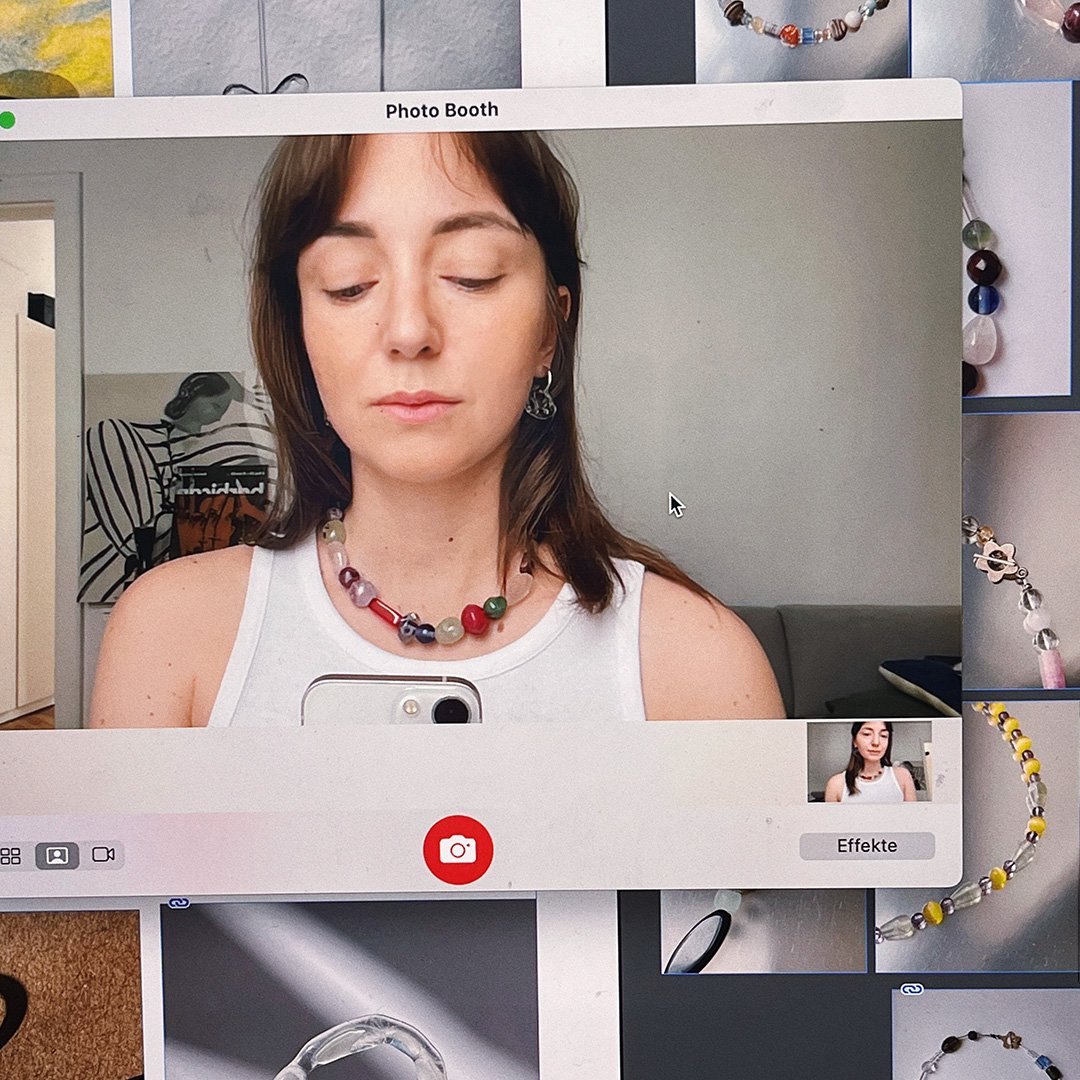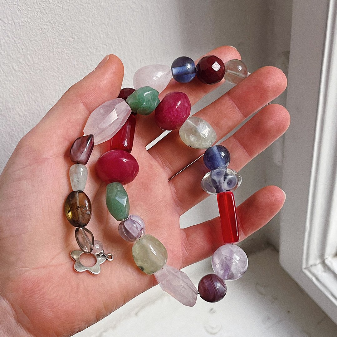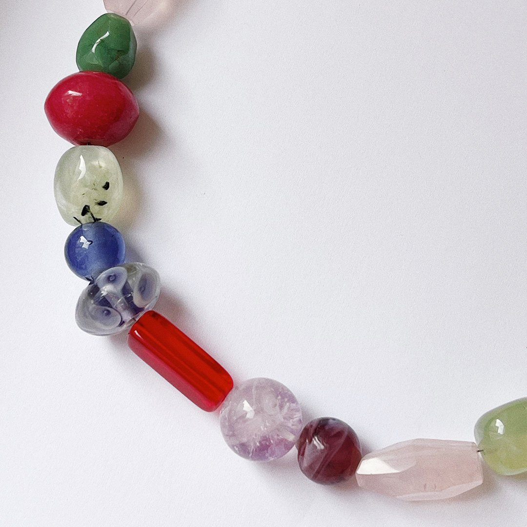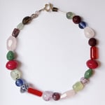 A one of a kind necklace made from second-hand glass beads in varying shapes and colours, arranged in a loose, intuitive composition. Deep reds, soft pinks, greens and blues come together in a balanced way.