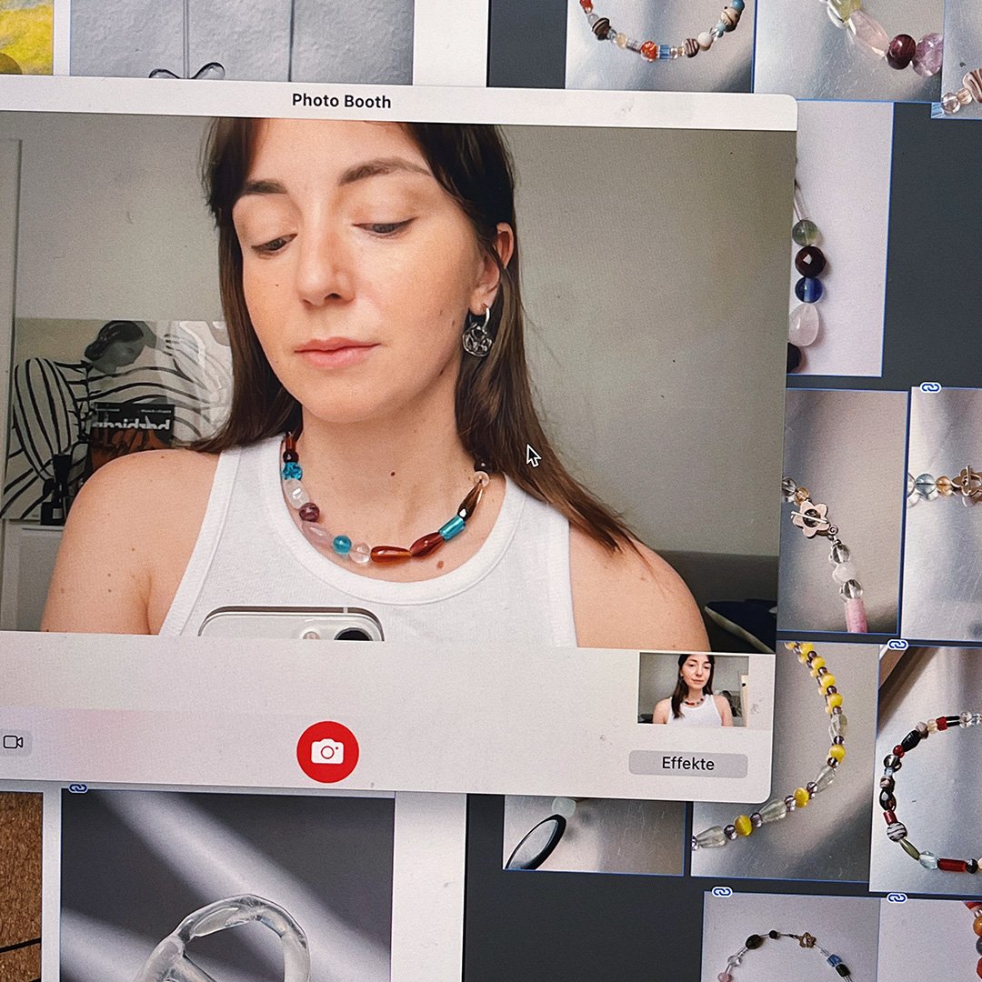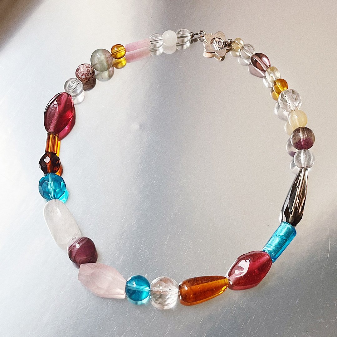 A one-of-a-kind necklace made from second-hand glass beads in varying shapes and colors, arranged in a loose, intuitive composition. Deep burgundies, soft rose pinks, warm honey yellows, and vibrant cyan blues come together in a balanced way, accented by smoky greys and clear, faceted crystals.