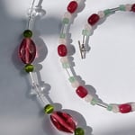 A one-of-a-kind necklace made from second-hand glass beads in varying shapes and colors, arranged in a loose, intuitive composition. Vibrant reds, mossy greens, and crystal clears come together in a balanced way.
