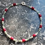 A one-of-a-kind necklace made from second-hand glass beads in varying shapes and colors, arranged in a loose, intuitive composition. Deep berry reds, soft pastel pinks, and earthy sage greens come together in a balanced way.