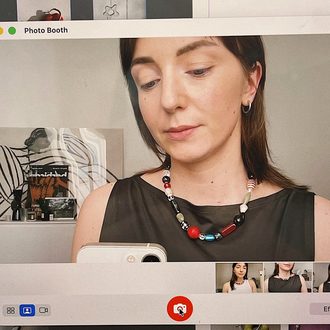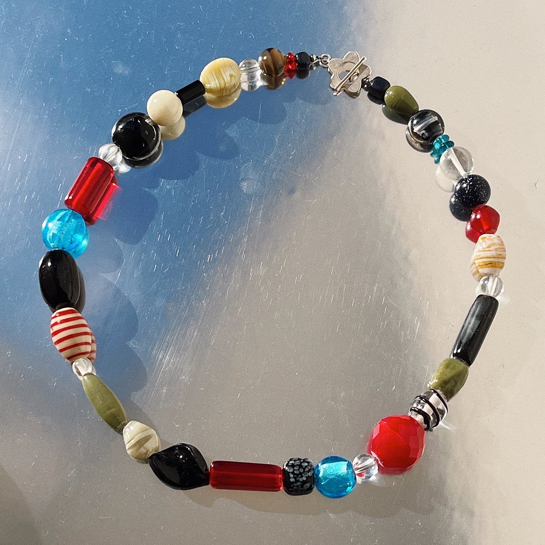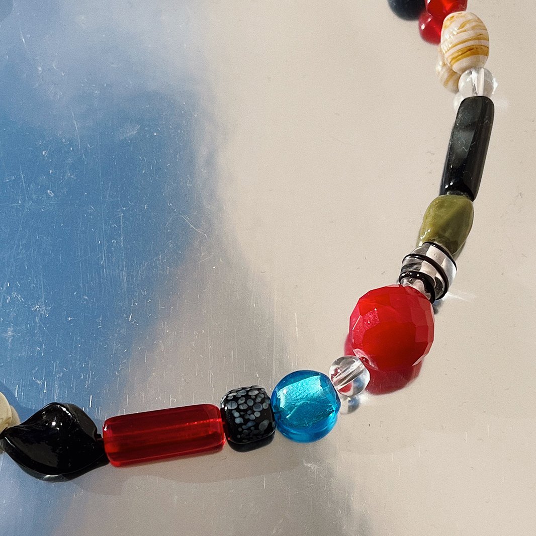 A one-of-a-kind necklace made from second-hand glass beads in varying shapes and tones, arranged in an intuitive composition. The strand includes a varied selection of glass in black, red, blue, and green tones, alongside patterned beads. Clear and milky white beads provide subtle contrasts in transparency and texture.