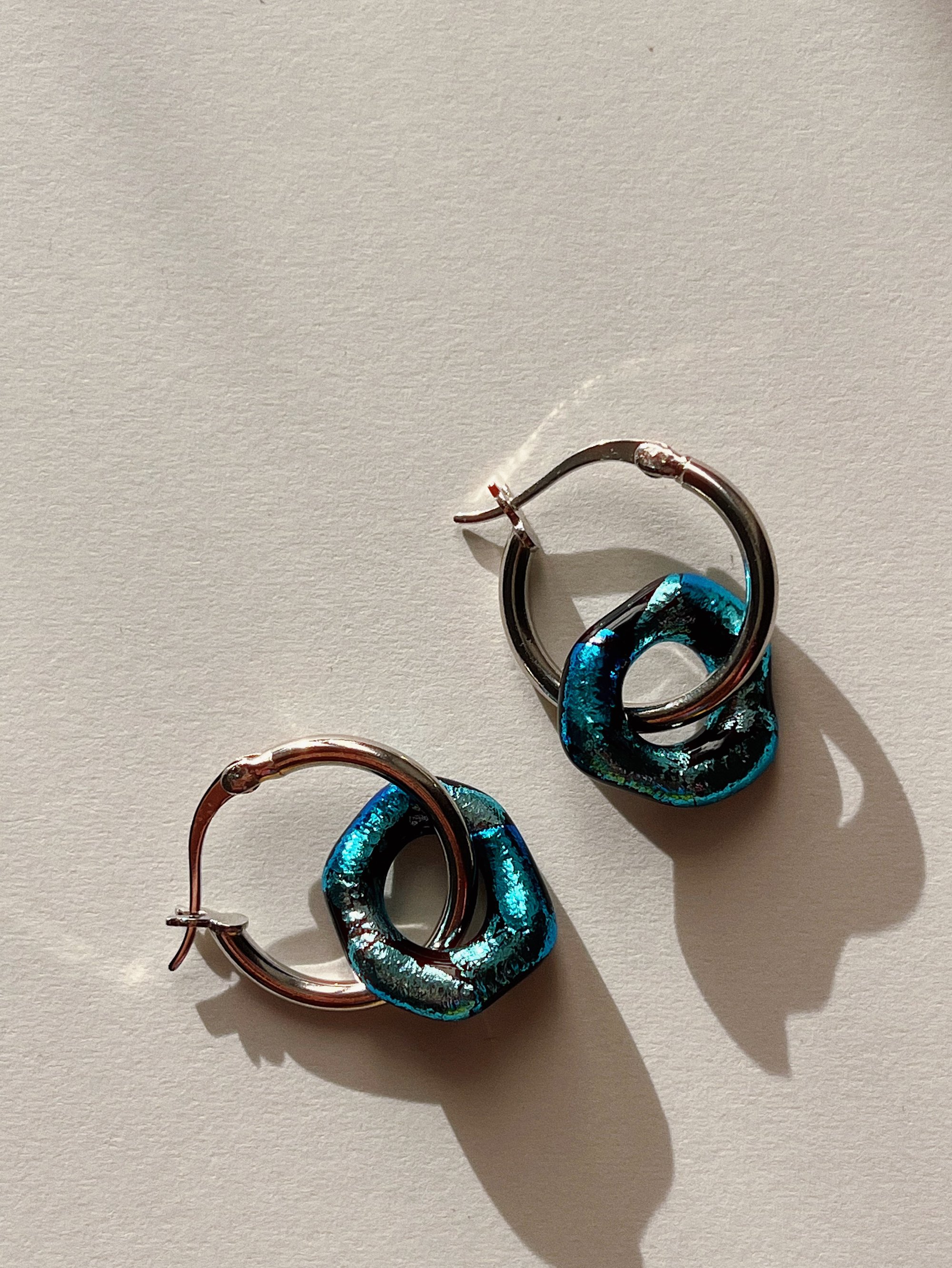 Hoops in silver paired with handmade glass pendants with a shiny texture.