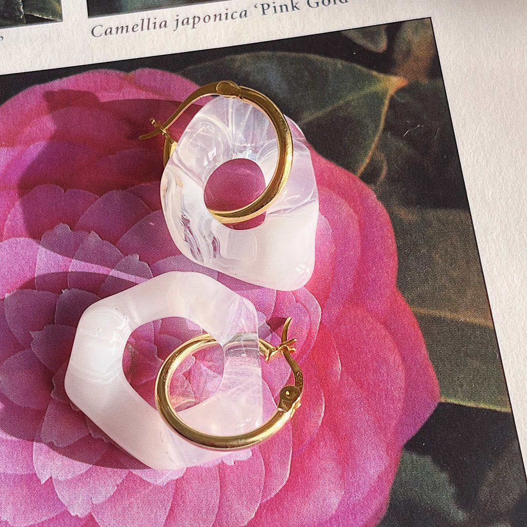 Hoops in gold paired with handmade glass pendants in white and clear.
